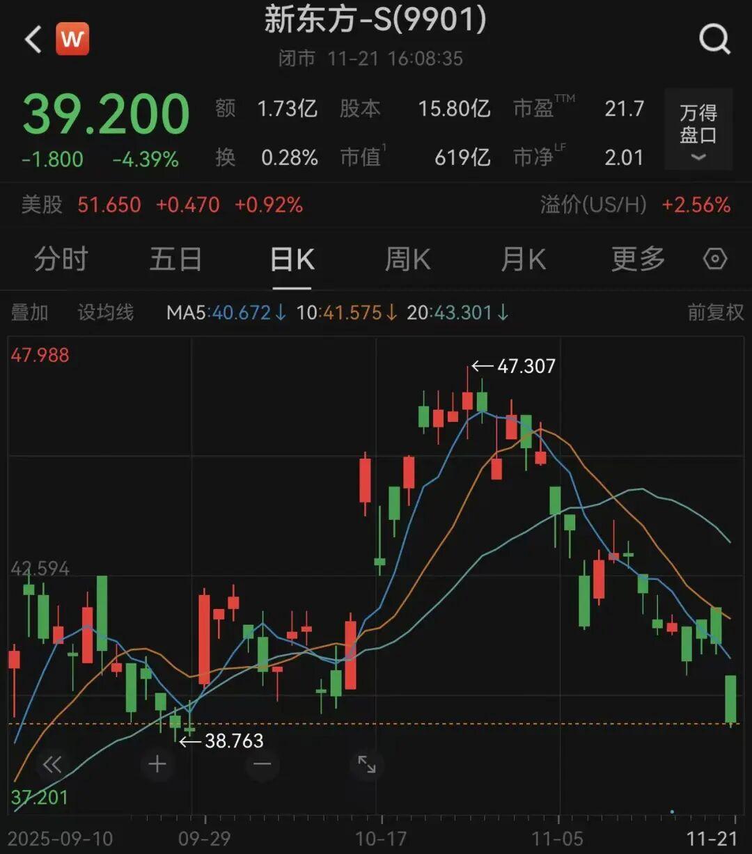 二级市场上,港股新东方自风波以来,股价已连跌4日,截至11月21日收盘,股价收跌4.39%,报39.2港元,最新市值为619亿港元。