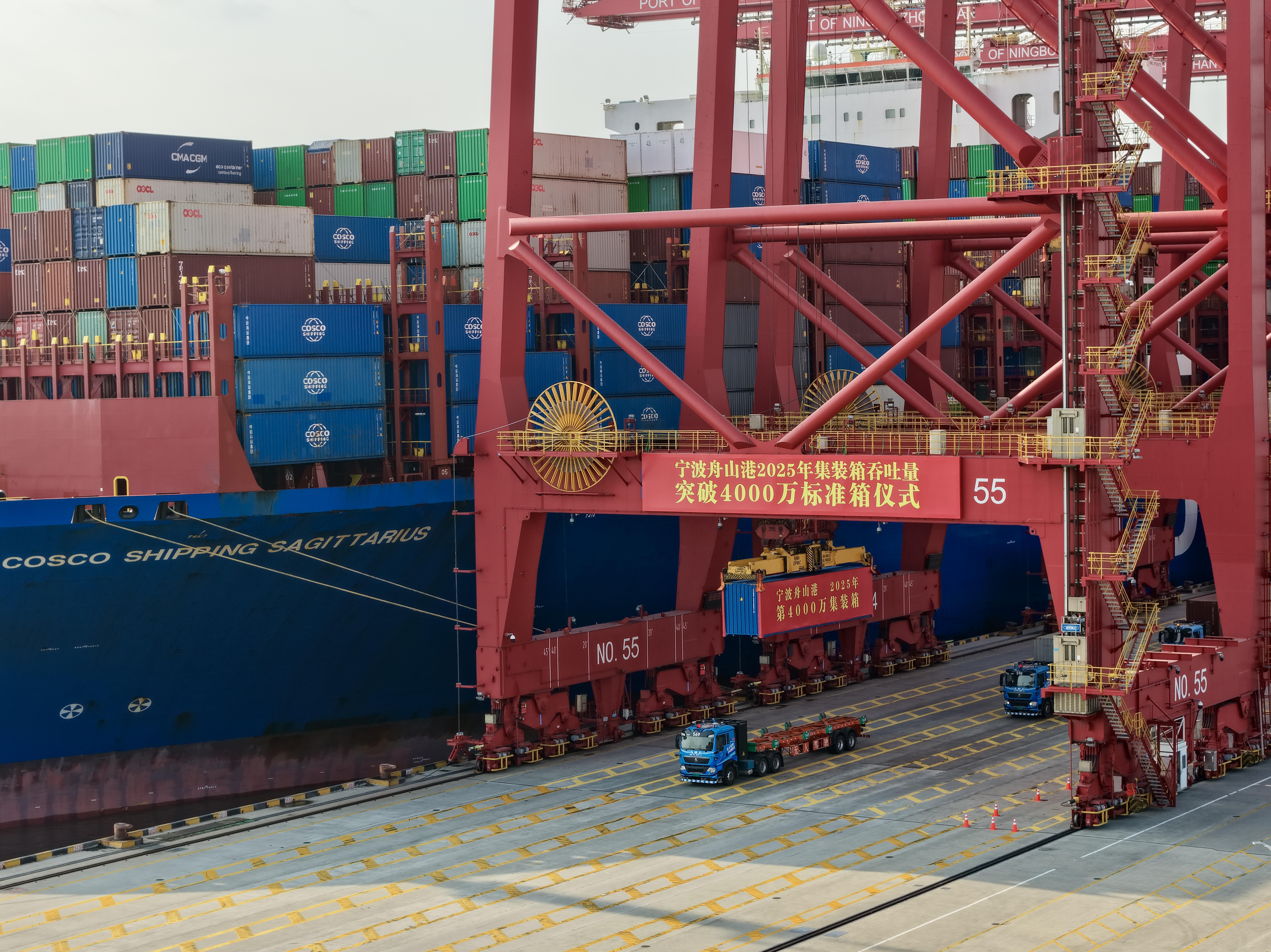 今天上午9点10分,宁波舟山港迎来了一个重要里程碑——年集装箱吞吐量首次突破4000万标准箱,实现了港口发展的第四个“千万箱级”跨越,为中国制造业走向海外提供了坚实支撑。