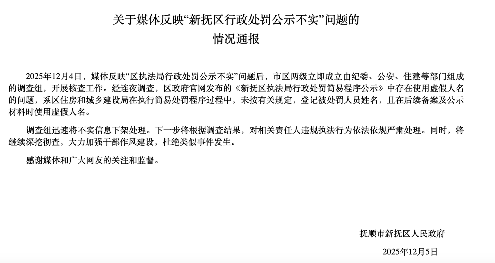 类似情况也出现在辽宁抚顺市新抚区。2022年5月,区政府网站发布的行政处罚名单中,张吉惟、林国瑞、江奕云因占道经营被罚款,但公示已被删除。新抚区政府通报称,该行为属于使用虚假人名登记行政处罚,责任单位及人员将依法依规处理。