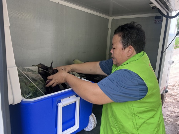 12月27日,工作人员正向无人驾驶车上装运果蔬。(受访者供图)